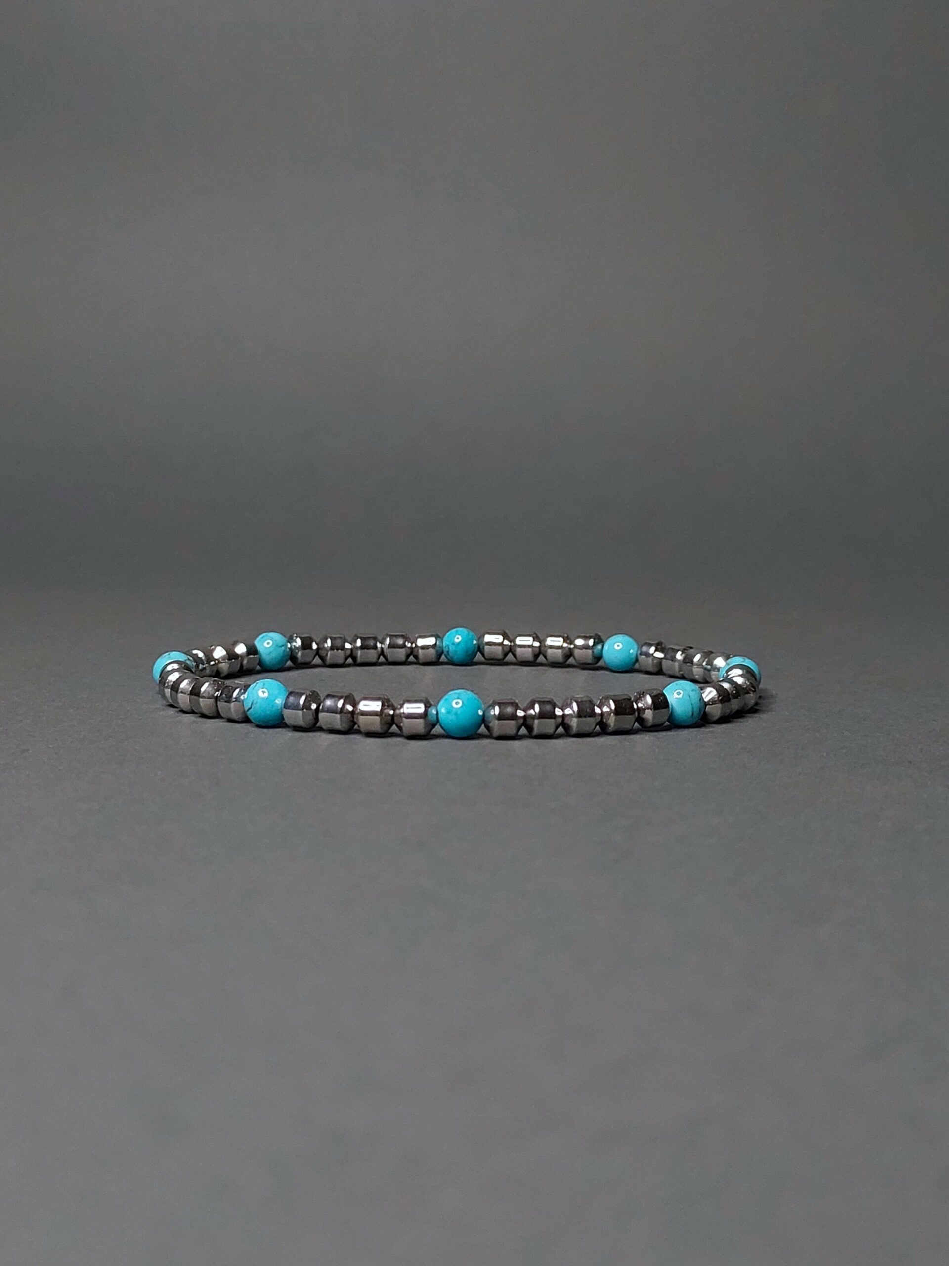 Браслет зроблений з намистин натурального каменю гематит та бірюзи. Діаметр намистин гематиту 4х2 мм., діаметр намистин бірюзи 4 мм.