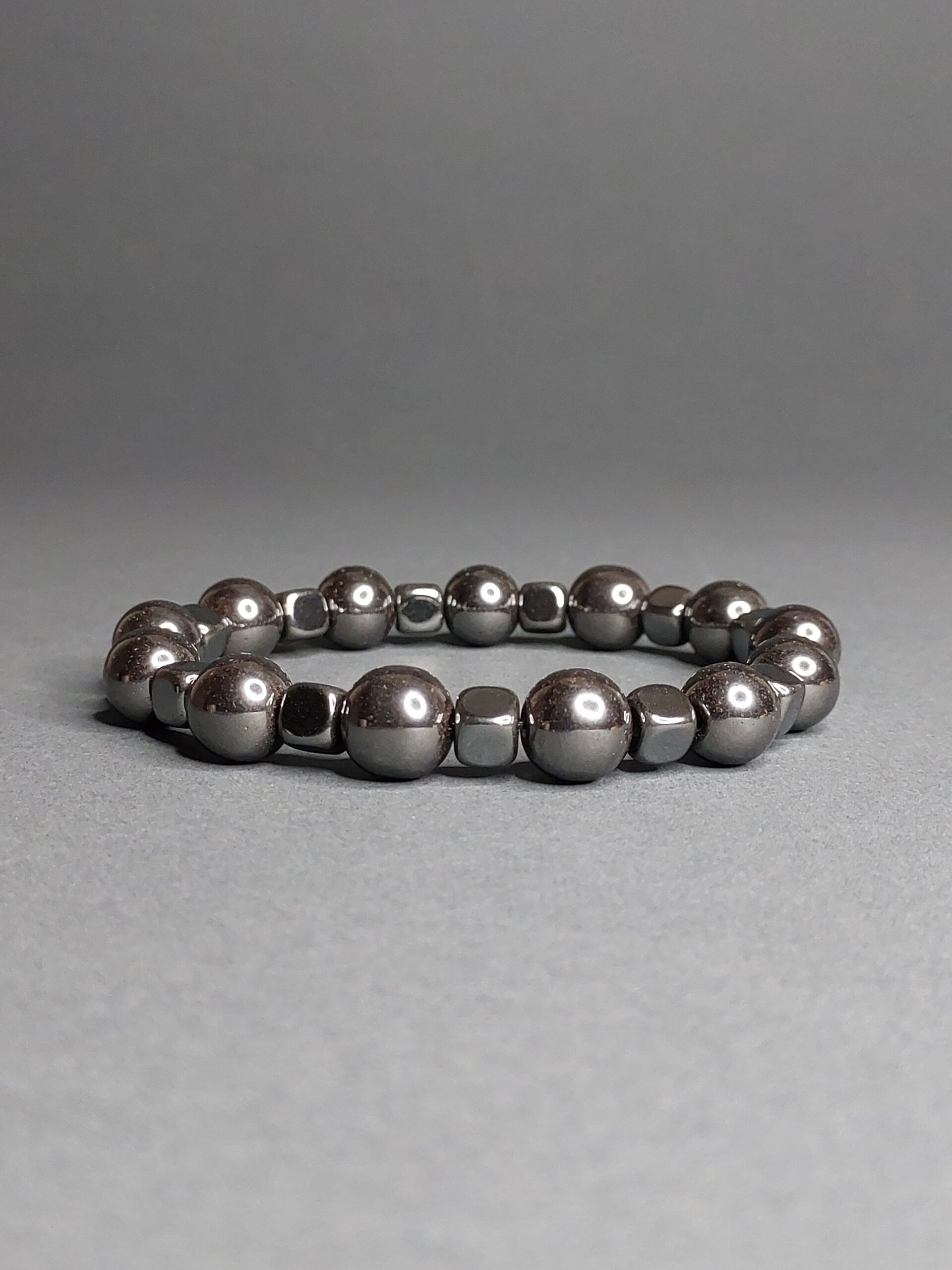 Діаметр круглих намистин 10 мм, квадратних 4*4 мм. Намистини браслета зібрані на еластичну нитку.