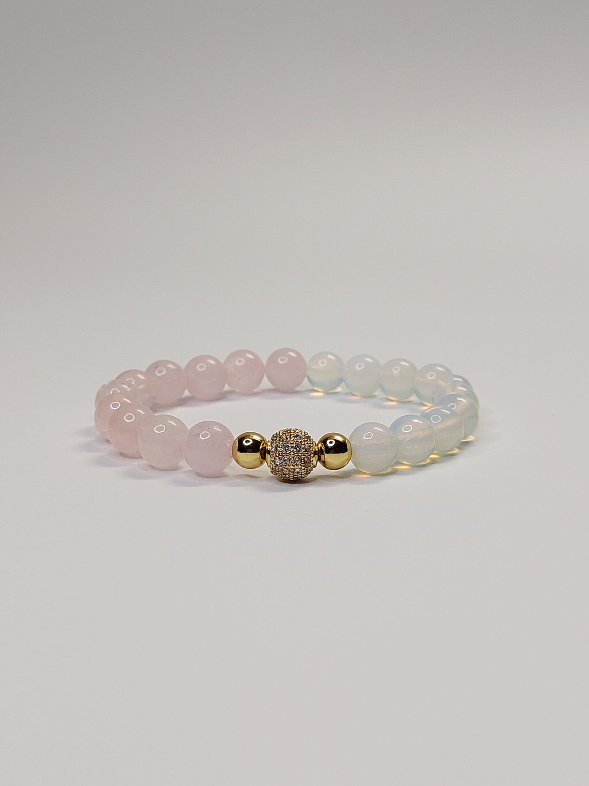 Діаметр намистин рожевий кварц та місячний камінь 8 мм.