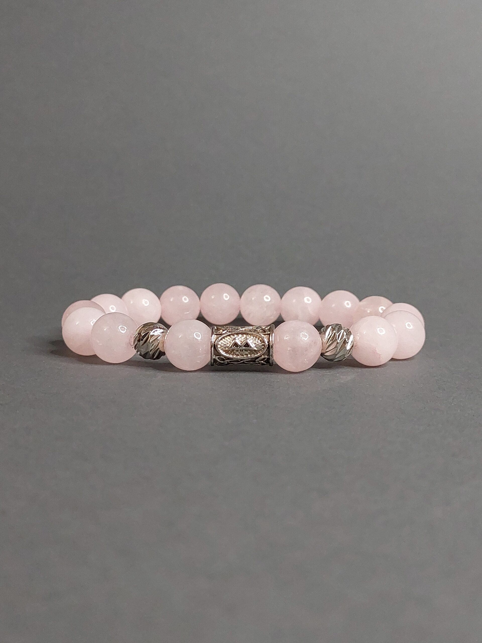 Браслет з рунами зроблений з намистин натурального рожевого кварцу. Діаметр намистин рожевого кварцу 8 мм.