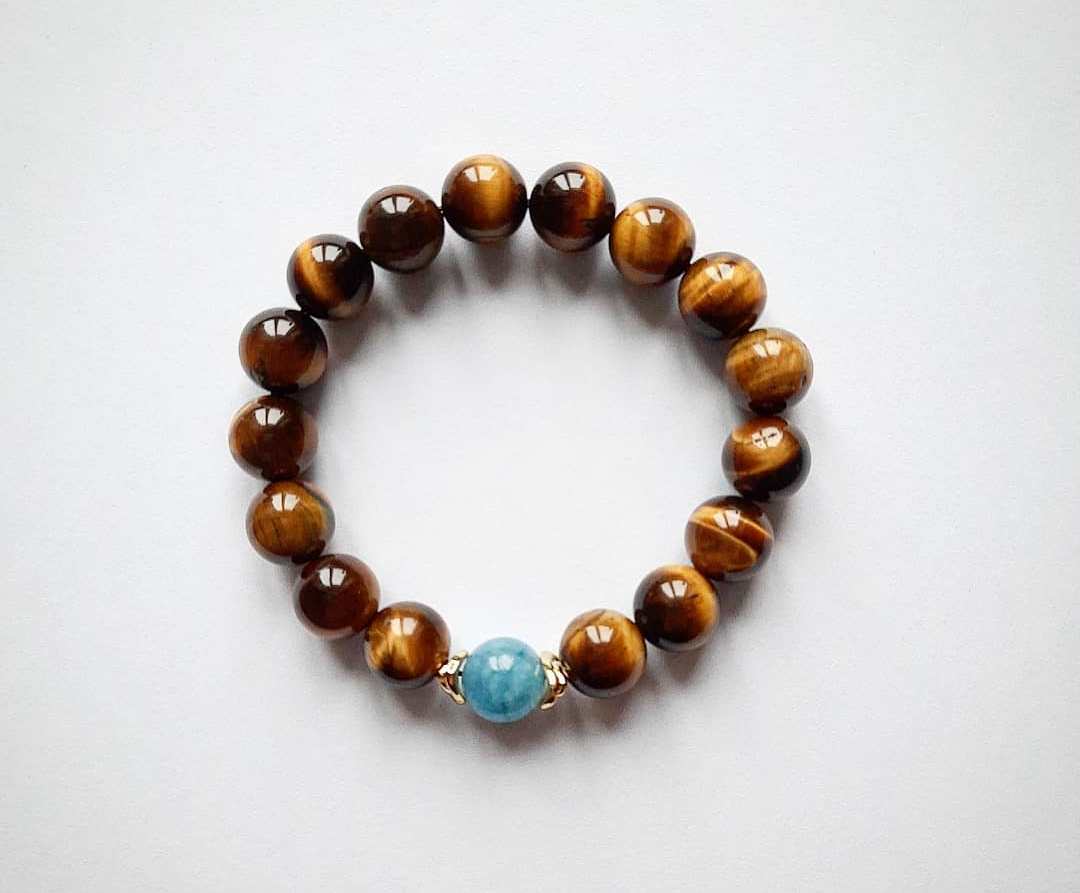 Браслет зроблений з намистин натурального каміння тигрове око та аквамарину.