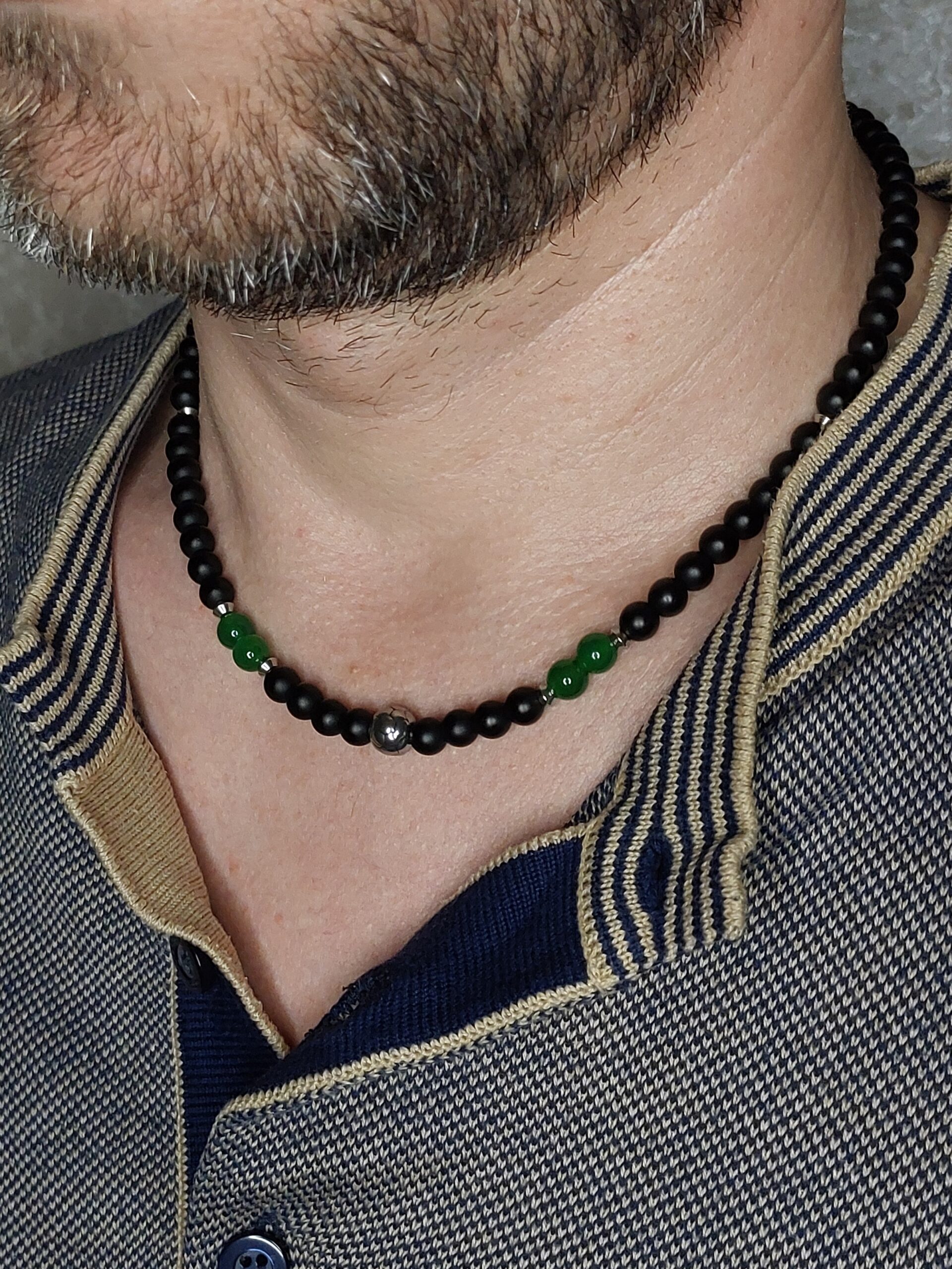 Чоловічий чокер з хризопраза та шунгіту, зроблений з намистин натурального каміння.